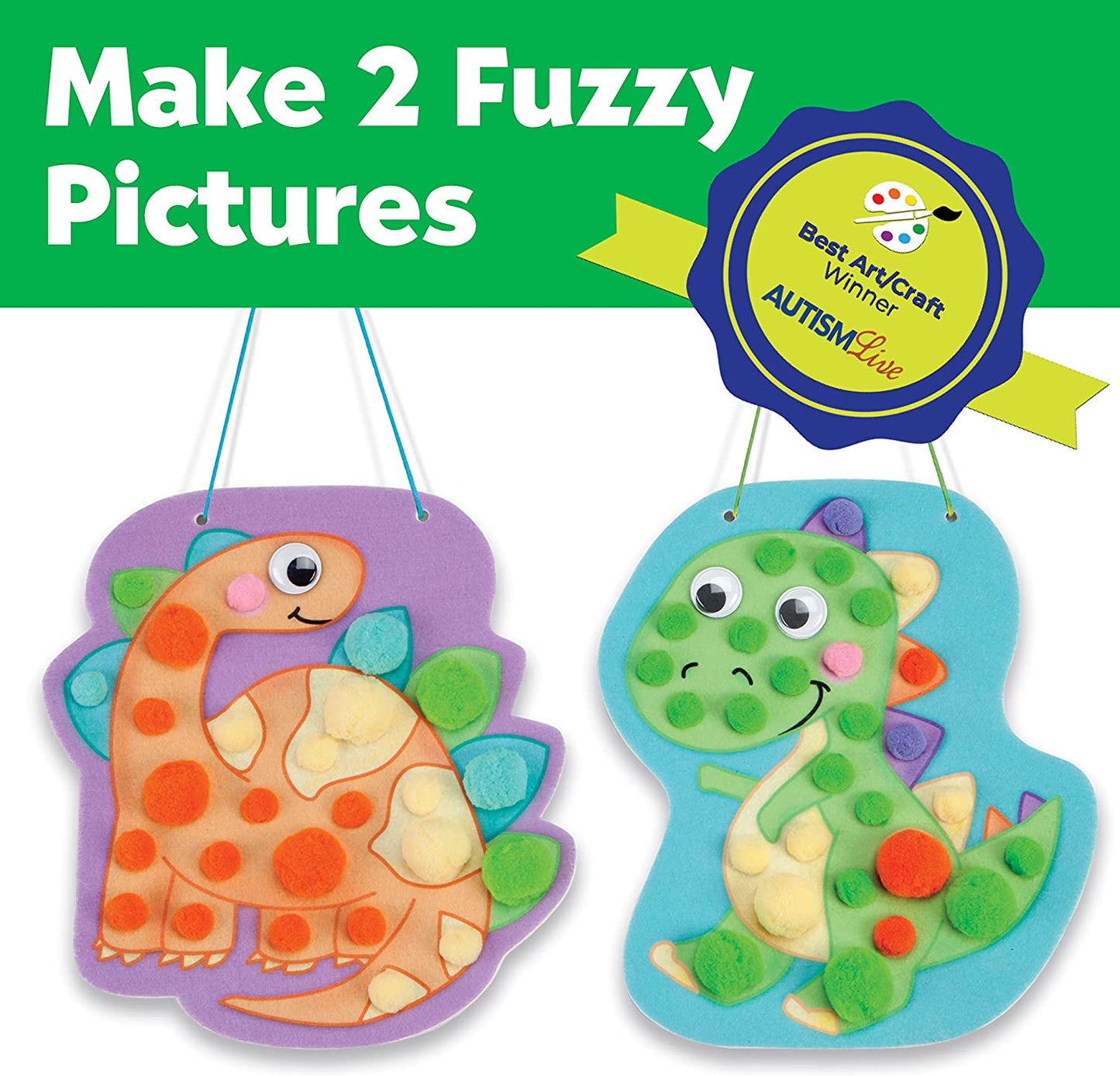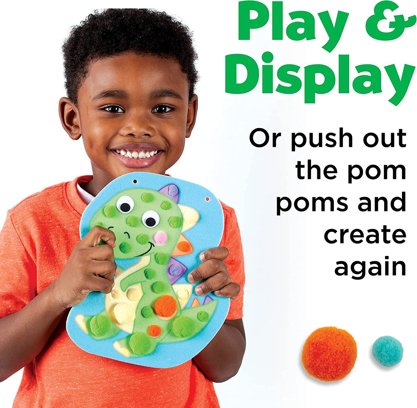 Preschool age kids will have fun discovering colors and sizes as they witness dinosaur friends come to life through this engaging art activity. Tailored for toddlers, interactive "pop & push" pom pom kit requires no glue, ensuring less mess, more fun and allowing for repeated use! 2 illustrated, soft foam felt boards securely hold brightly colored pom poms in place. Contents Include: 2 Pre-cut illustrated felt boards, Assorted pom poms, 2 Hanging strings, Wiggly eyes, Storage bag and Instructions. Ages 3+