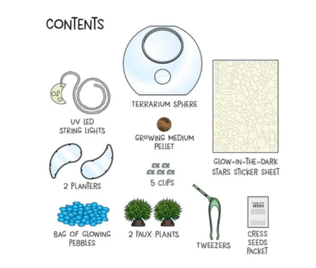 Get growing and glowing with Biology with your very own terrarium! Comes with real plants! Use the included cress seeds and growing containers to create your own plant display, and observe as the seeds germinate and grow. Decorate your terrarium with glowing materials like glow-in-the-dark stars and glowing plastic pebbles, as well as some faux plants. At night, your terrarium will light up a room when the included UV LED string lights (like blacklights) shine on the phosphorescent materials and make them glow! A fun, eight-page, full-color experiment guide assists you in setting up your terrarium and provides exciting educational content about plants and phosphorescence. Ages 6+